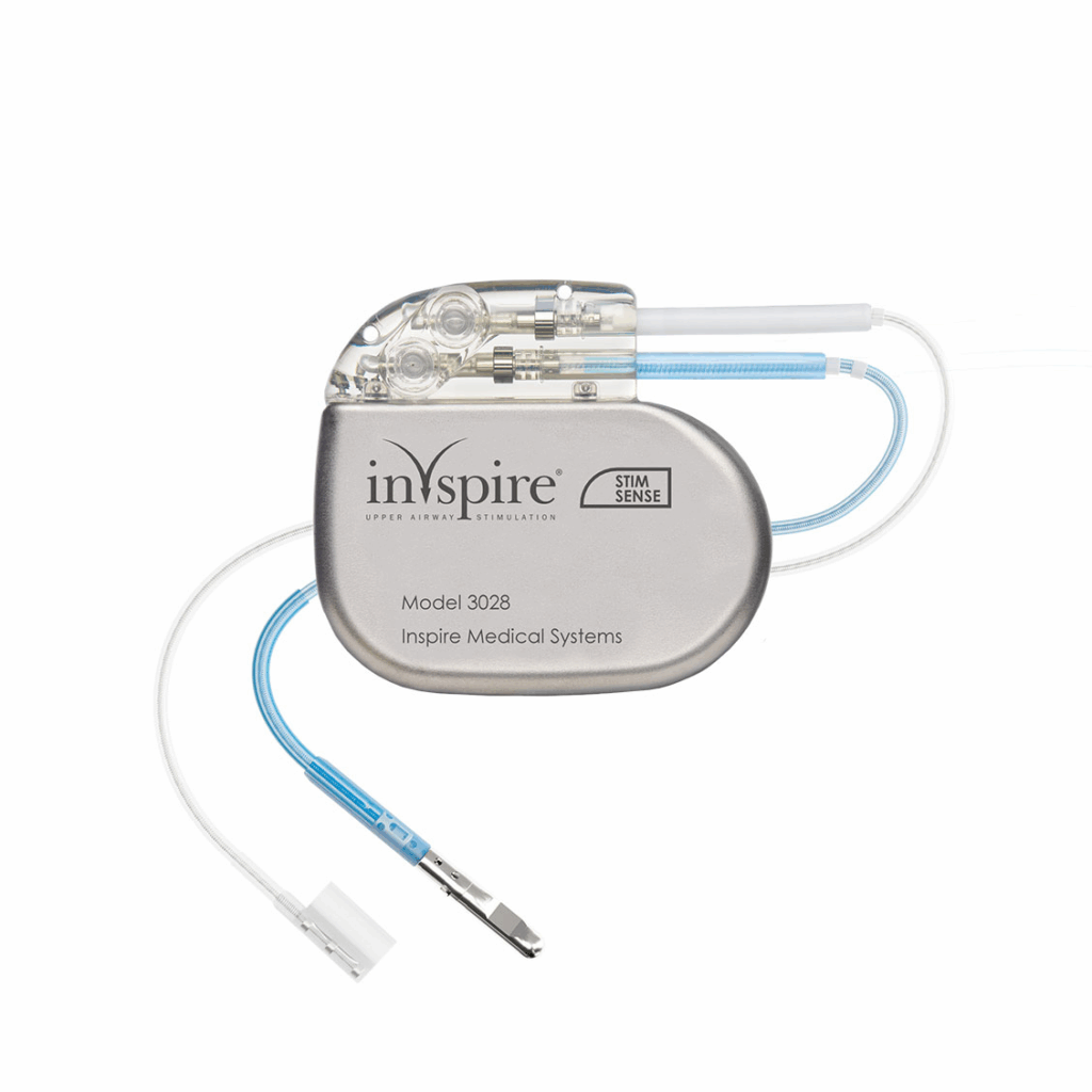 After a screening process (including a sleep study review and airway evaluation under anesthesia), we determine if Inspire® is right for you. If you are a candidate based on the airway evaluation, we would proceed with the implant. During the surgery, a small device is implanted in your chest, with a lead connected to the nerve that controls your tongue. Each night, you turn the device on with a remote — no mask, no hose.